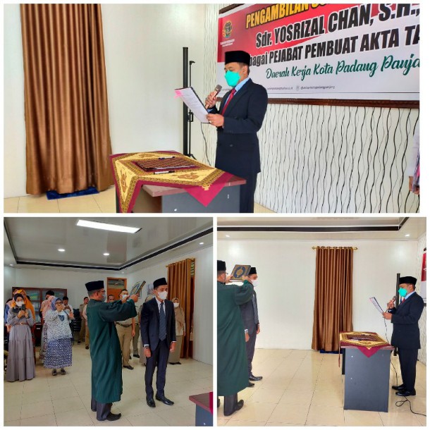 Diketahui pelaksanaan pelantikan dan pengambilan sumpah Yosrizal Chan, S.H., M.Kn., sebagai PPAT Kota Padang Panjang dihadiri dan disaksikan: Para PPAT se Kota Padang Panjang, Para Pejabat Pengawas di Lingkungan Kantor Pertanahan Kota Padang Panjang, para Pejabat Fungsional dan Koordinator Sub Kegiatan di Lingkungan Kantor Pertanahan Kota Padang Panjang, Para Analis dan Aparatur Sipil Negara di Lingkungan Kantor Pertanahan Kota Padang Panjang dan tetap menetapkan protokol kesehatan, dengan menjaga jarak menggunaka masker dan mencuci tangan. (Red)