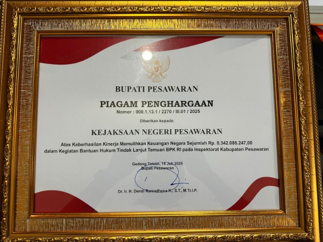 “Secara rinci, penghargaan pertama diberikan oleh Inspektorat Daerah Pesawaran atas keberhasilan Kejaksaan Negeri Pesawaran dalam memulihkan keuangan negara senilai Rp8.342.086.247. Pemulihan tersebut dilakukan melalui pemberian bantuan hukum non litigasi dalam tindak lanjut temuan Badan Pemeriksa Keuangan Republik Indonesia (BPK RI),” terangnya.