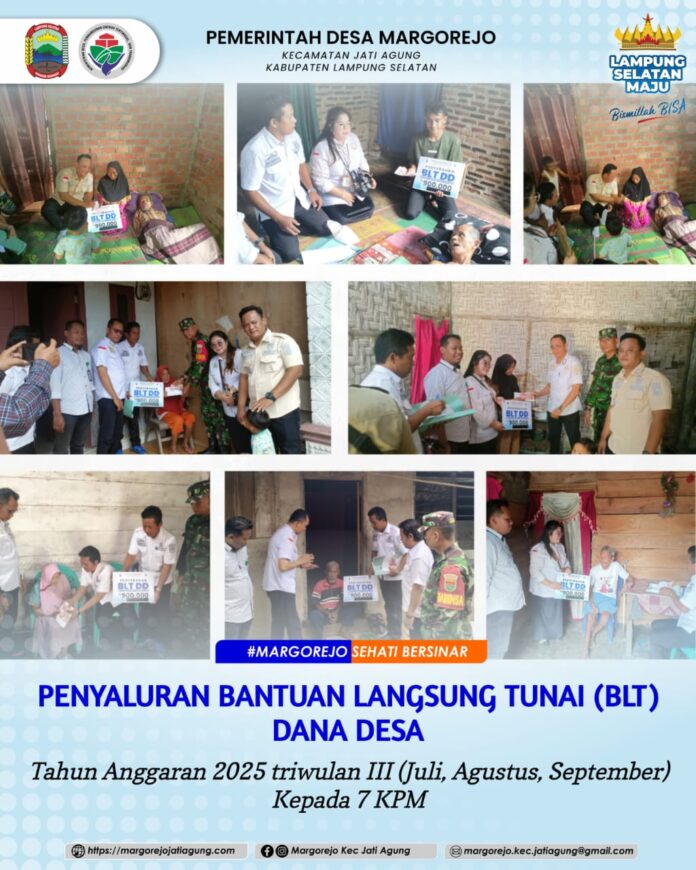 Lampung Selatan (HO) – Pemerintah desa (Pemdes) Margorejo, Kecamatan Jati Agung, Kabupaten Lampung Selatan, Provinsi Lampung menyalurkan BLT DD (Bantuan langsung tunai) dana desa secara door to door kepada warga yang terdampak penyakit menahun. Penyaluran ini dilakukan untuk memastikan bantuan sampai tepat sasaran, terutama kepada warga yang memiliki keterbatasan mobilitas atau sedang sakit.