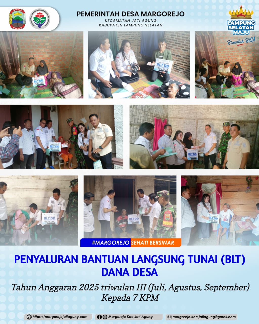 Berto Julian Kades Margorejo membenarkan. Mereka hari ini membagikan Bantuan langsung tunai dana desa (BLT DD) tahun anggaran tahun 2025 tahap lll bulan Juli, Agustus dan September kepada sebanyak 7 keluarga penerima manfaat (KPM). Masing-masing KPM Mendapatkan sebesar Rp. 900.000.