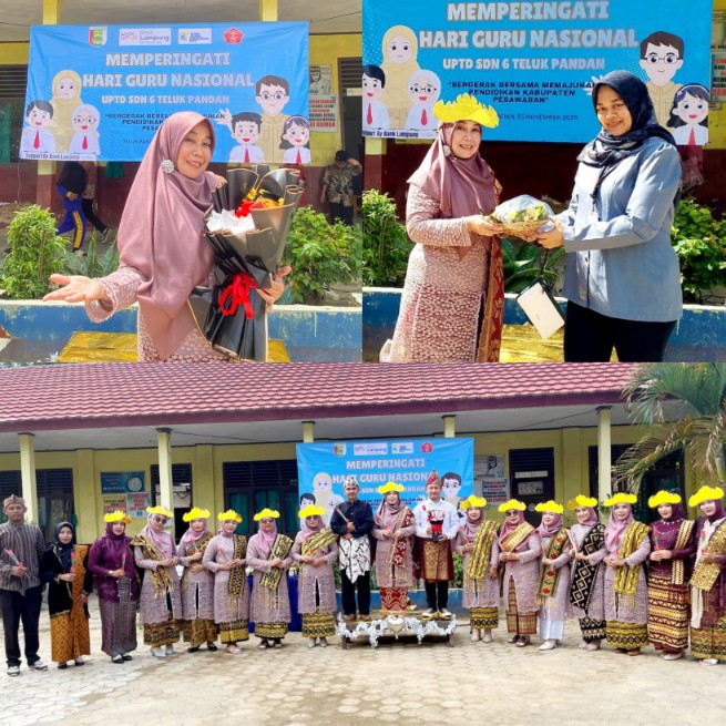 Pesawaran (HO) – UPTD Sekolah Dasar Negeri (SDN) 6 Teluk Pandan Kabupaten Pesawaran, Provinsi Lampung menggelar upacara dan serangkaian kegiatan peringatan Hari Guru Nasional (HGN) tahun 2025 di lapangan sekolah. Acara berlangsung meriah dengan partisipasi aktif seluruh siswa dan guru. Selain itu, acara tersebut disponsori oleh Bank Lampung.